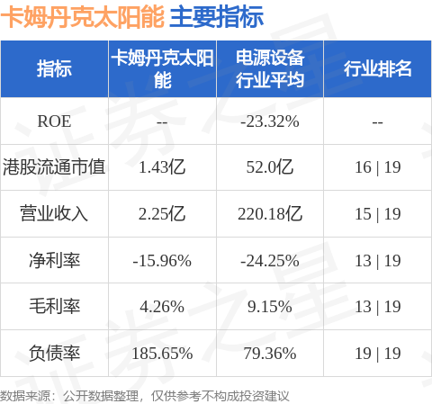 卡姆丹克太阳能港股市值1.43亿港元,在电源设备行业中排名第16。主要指标见下表: