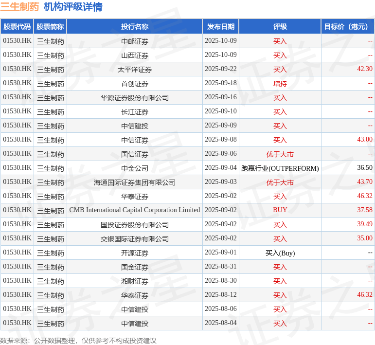 投行对该股的评级以买入为主,近90天内共有15家投行给出买入评级,近90天的目标均价为41.13港元。中邮证券最新一份研报给予三生制药买入评级。