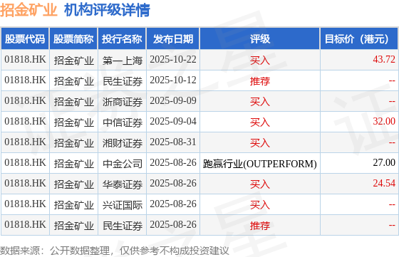 截至2025年10月31日收盘,招金矿业(01818.HK)报收于29.06港元,下跌0.27%,成交量920.04万股,成交额2.7亿港元。投行对该股的评级以买入为主,近90天内共有6家投行给出买入评级,近90天的目标均价为31.82港元。第一上海最新一份研报给予招金矿业买入评级,目标价43.72港元。