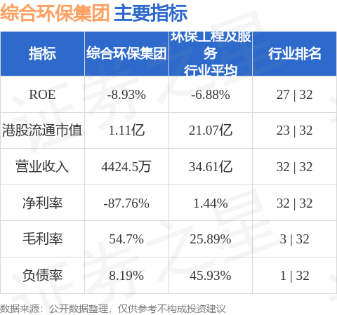 综合环保集团港股市值1.11亿港元,在环保工程及服务行业中排名第23。主要指标见下表: