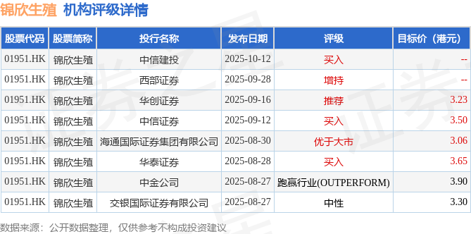 截至2025年10月31日收盘,锦欣生殖(01951.HK)报收于2.46港元,下跌2.38%,成交量2095.25万股,成交额5203.53万港元。投行对该股的评级以买入为主,近90天内共有3家投行给出买入评级,近90天的目标均价为3.44港元。中信建投最新一份研报给予锦欣生殖买入评级。