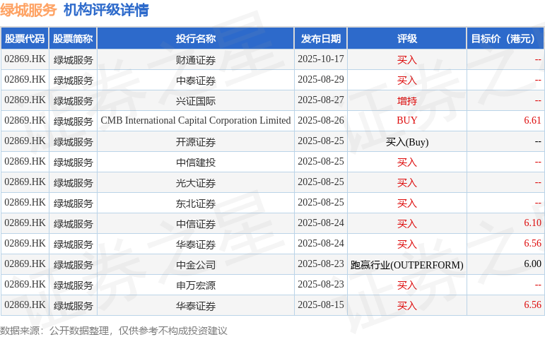 截至2025年10月31日收盘,绿城服务(02869.HK)报收于4.47港元,下跌1.32%,成交量357.2万股,成交额1607.62万港元。投行对该股的评级以买入为主,近90天内共有9家投行给出买入评级,近90天的目标均价为6.37港元。财通证券最新一份研报给予绿城服务买入评级。