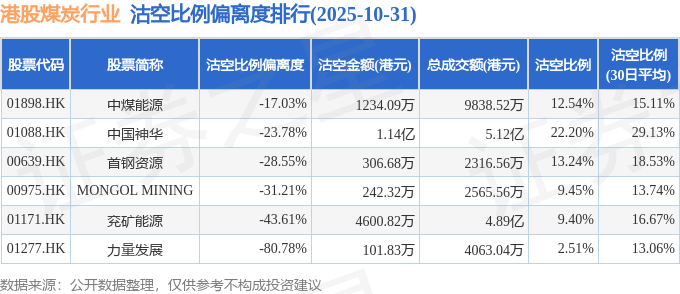从沽空比例偏离度来看,中煤能源、中国神华、首钢资源沽空比例偏离度位居行业前三,分别为-17.03%、-23.78%、-28.55%。