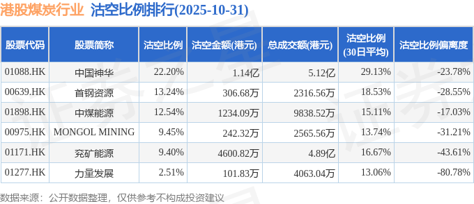 证券之星消息,10月31日港交所披露数据显示,当日港股煤炭行业的22只个股中有6只被沽空,总沽空股数为1016.15万股,总沽空金额为1.79亿元(港元),而当日煤炭行业的总成交金额为12.48亿元(港元),沽空比例为14.31%。当日煤炭行业总体跌2.21%。