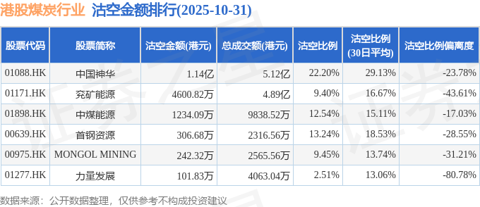 从沽空金额来看,中国神华、兖矿能源、中煤能源沽空金额位居行业前三,分别为1.14亿港元、4600.82万港元、1234.09万港元。