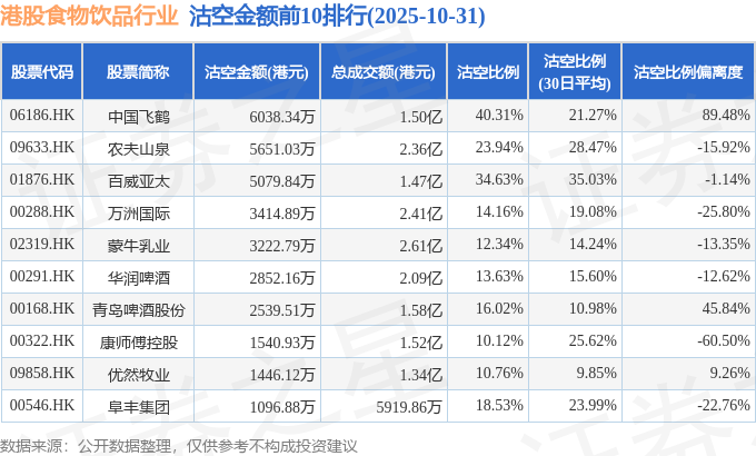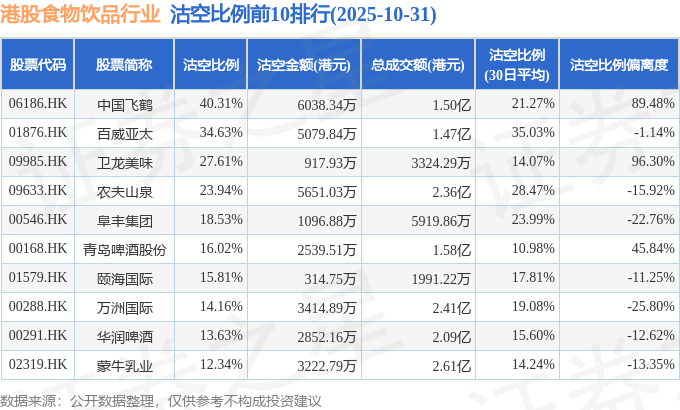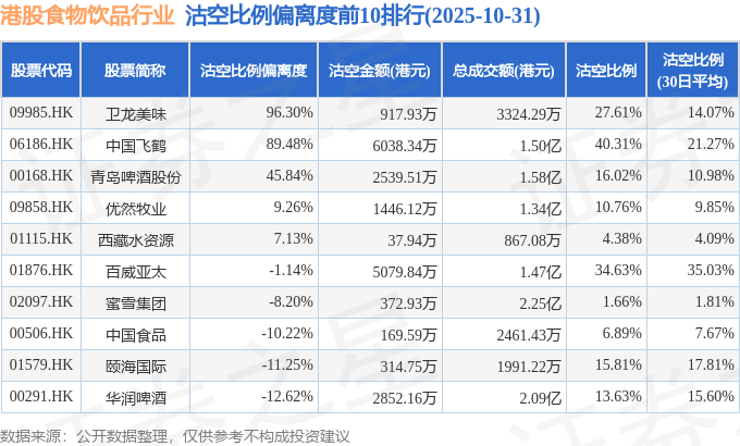从沽空比例来看,中国飞鹤、百威亚太、卫龙美味沽空比例位居行业前三,分别为40.31%、34.63%、27.61%。