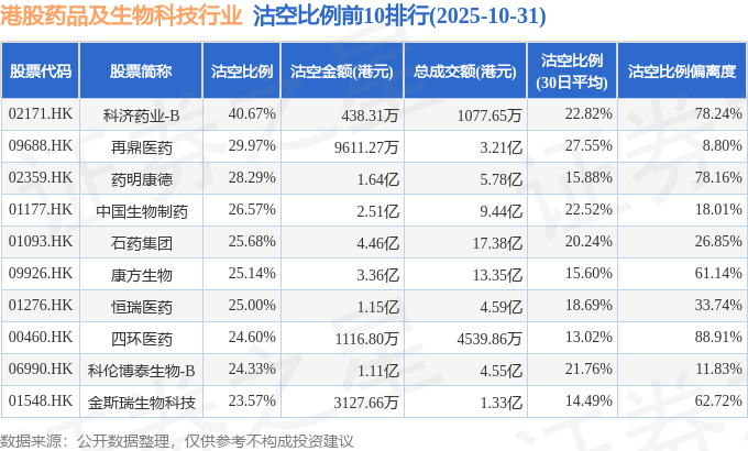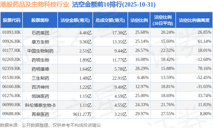 从沽空金额来看,石药集团、康方生物、中国生物制药沽空金额位居行业前三,分别为4.46亿港元、3.36亿港元、2.51亿港元。
