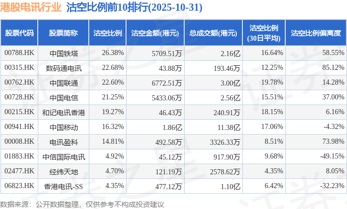 从沽空比例来看,中国铁塔、数码通电讯、中国联通沽空比例位居行业前三,分别为26.38%、22.68%、22.6%。