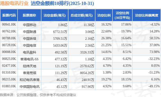 从沽空金额来看,中国移动、中国联通、中国铁塔沽空金额位居行业前三,分别为1.86亿港元、6772.51万港元、5709.51万港元。