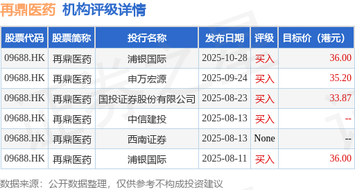 截至2025年10月31日收盘,再鼎医药(09688.HK)报收于20.1港元,下跌1.37%,成交量1598.25万股,成交额3.21亿港元。投行对该股的评级以买入为主,近90天内共有5家投行给出买入评级,近90天的目标均价为35.27港元。浦银国际最新一份研报给予再鼎医药买入评级,目标价36港元。