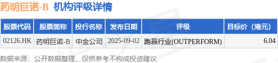 投行对该股的评级以跑赢行业(OUTPERFORM)为主,近90天内共有1家投行给出跑赢行业(OUTPERFORM)评级,近90天的目标均价为6.04港元。中金公司最新一份研报给予药明巨诺-B跑赢行业(OUTPERFORM)评级,目标价6.04港元。