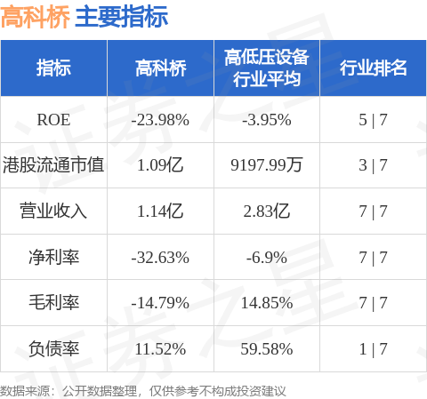 高科桥港股市值1.09亿港元,在高低压设备行业中排名第3。主要指标见下表:
