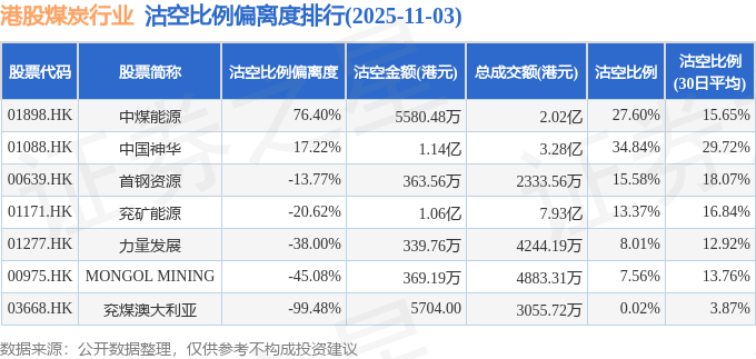 从沽空比例偏离度来看,中煤能源、中国神华、首钢资源沽空比例偏离度位居行业前三,分别为76.4%、17.22%、-13.77%。