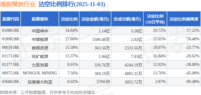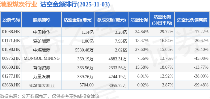 从沽空金额来看,中国神华、兖矿能源、中煤能源沽空金额位居行业前三,分别为1.14亿港元、1.06亿港元、5580.48万港元。
