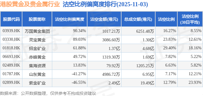 从沽空比例偏离度来看,万国黄金集团、灵宝黄金、招金矿业沽空比例偏离度位居行业前三,分别为90.34%、89.03%、61.88%。