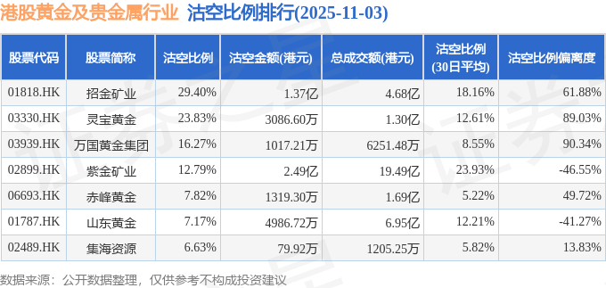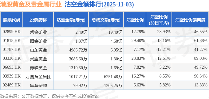 从沽空金额来看,紫金矿业、招金矿业、山东黄金沽空金额位居行业前三,分别为2.49亿港元、1.37亿港元、4986.72万港元。