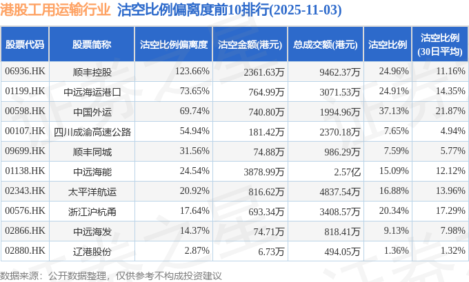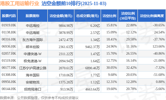 从沽空金额来看,中远海控、中远海能、东方海外国际沽空金额位居行业前三,分别为9804.98万港元、3878.99万港元、2472.47万港元。