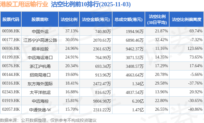从沽空比例偏离度来看,顺丰控股、中远海运港口、中国外运沽空比例偏离度位居行业前三,分别为123.66%、73.65%、69.74%。