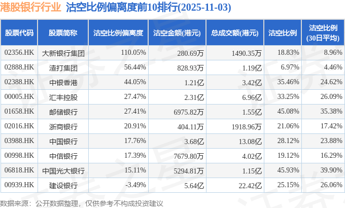 从沽空比例来看,中国光大银行、邮储银行、中银香港沽空比例位居行业前三,分别为45.93%、45.08%、35.46%。