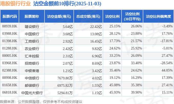 从沽空金额来看,建设银行、中国银行、工商银行沽空金额位居行业前三,分别为5.64亿港元、3.68亿港元、2.92亿港元。