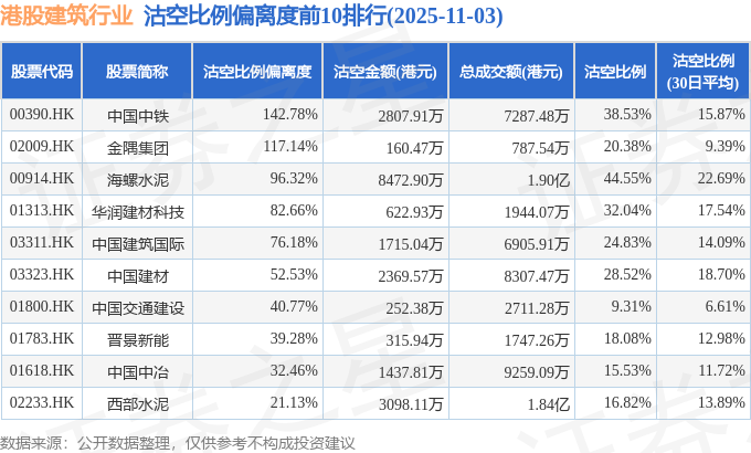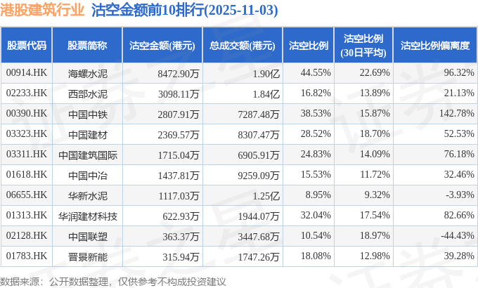 从沽空金额来看,海螺水泥、西部水泥、中国中铁沽空金额位居行业前三,分别为8472.9万港元、3098.11万港元、2807.91万港元。