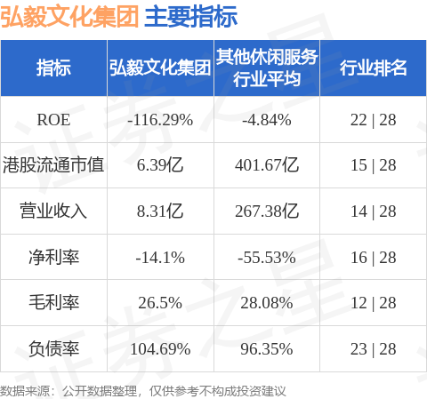 弘毅文化集团港股市值6.39亿港元,在其他休闲服务行业中排名第15。主要指标见下表: