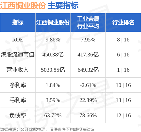 江西铜业股份港股市值450.38亿港元,在工业金属行业中排名第6。主要指标见下表: