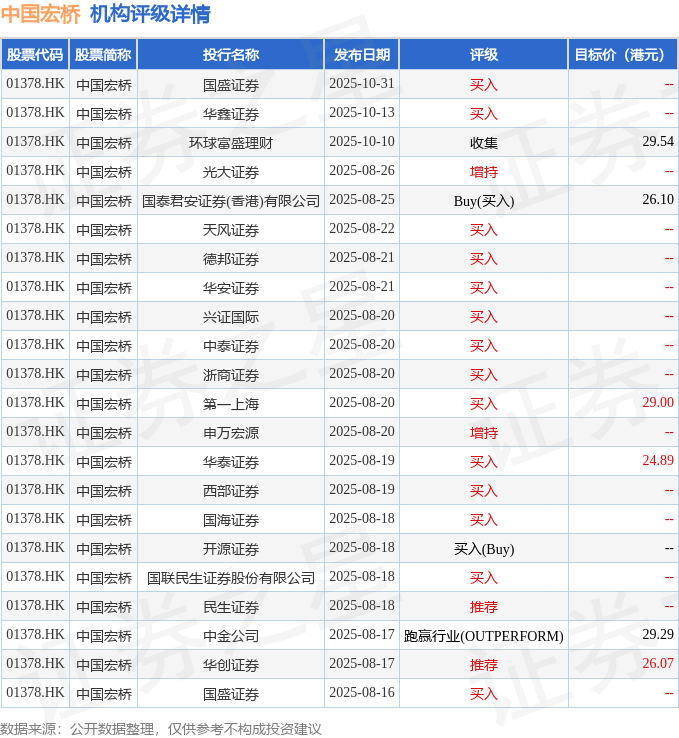 投行对该股的评级以买入为主,近90天内共有14家投行给出买入评级,近90天的目标均价为27.48港元。国盛证券最新一份研报给予中国宏桥买入评级。