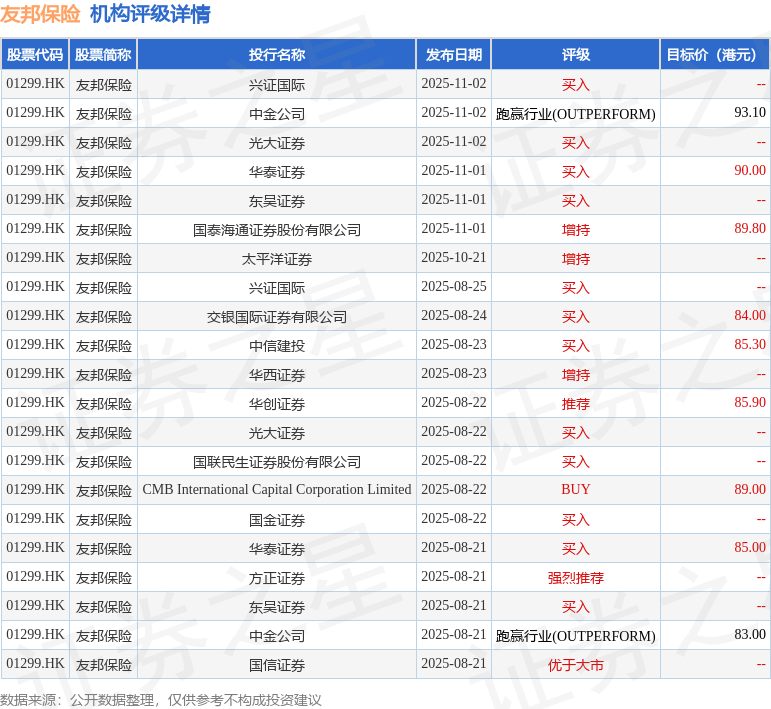 投行对该股的评级以买入为主,近90天内共有12家投行给出买入评级,近90天的目标均价为87.23港元。兴证国际最新一份研报给予友邦保险买入评级。