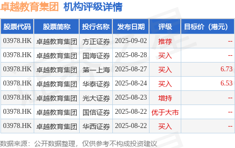 截至2025年11月4日收盘,卓越教育集团(03978.HK)报收于5.2港元,下跌2.62%,成交量54.87万股,成交额286.48万港元。投行对该股的评级以买入为主,近90天内共有4家投行给出买入评级,近90天的目标均价为6.63港元。方正证券最新一份研报给予卓越教育集团推荐评级。