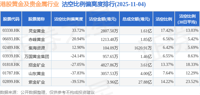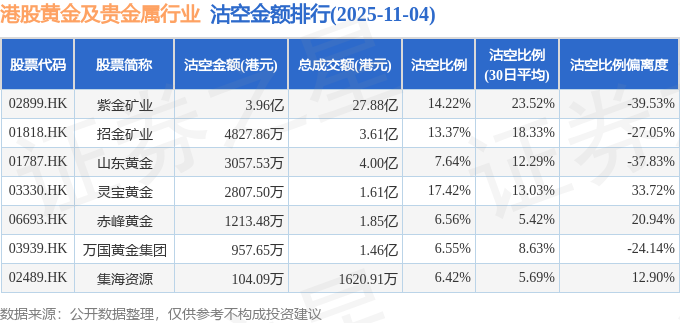 从沽空金额来看,紫金矿业、招金矿业、山东黄金沽空金额位居行业前三,分别为3.96亿港元、4827.86万港元、3057.53万港元。