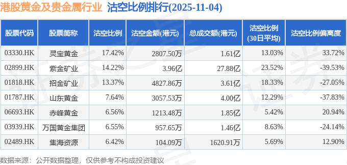 证券之星消息,11月4日港交所披露数据显示,当日港股黄金及贵金属行业的18只个股中有7只被沽空,总沽空股数为1910.21万股,总沽空金额为5.26亿元(港元),而当日黄金及贵金属行业的总成交金额为46.4亿元(港元),沽空比例为11.34%。当日黄金及贵金属行业总体跌3.7%。