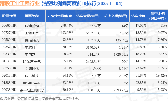 证券之星消息,11月4日港交所披露数据显示,当日港股工业工程行业的218只个股中有54只被沽空,总沽空股数为2.14亿股,总沽空金额为14.12亿元(港元),而当日工业工程行业的总成交金额为98.92亿元(港元),沽空比例为14.28%。当日工业工程行业总体跌1.94%。