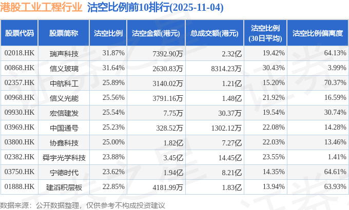 从沽空比例来看,瑞声科技、信义玻璃、中航科工沽空比例位居行业前三,分别为31.87%、31.64%、25.89%。