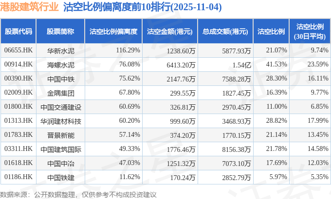 从沽空金额来看,海螺水泥、中国建材、中国中铁沽空金额位居行业前三,分别为6413.2万港元、2550.95万港元、2147.76万港元。