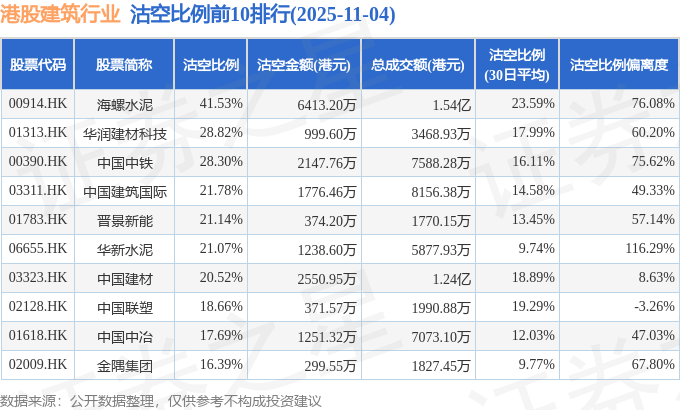 从沽空比例来看,海螺水泥、华润建材科技、中国中铁沽空比例位居行业前三,分别为41.53%、28.82%、28.3%。