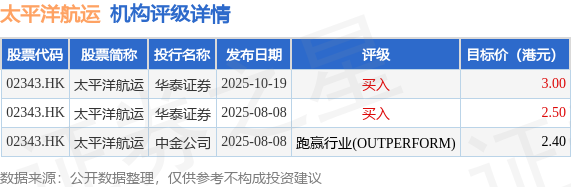 截至2025年11月4日收盘,太平洋航运(02343.HK)报收于2.59港元,下跌4.07%,成交量2707.26万股,成交额7108.82万港元。投行对该股的评级以买入为主,近90天内共有2家投行给出买入评级,近90天的目标均价为2.63港元。华泰证券最新一份研报给予太平洋航运买入评级,目标价3港元。