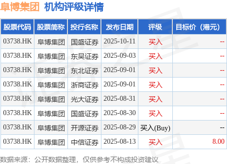 截至2025年11月5日收盘,阜博集团(03738.HK)报收于5.01港元,上涨1.83%,成交量2148.91万股,成交额1.04亿港元。投行对该股的评级以买入为主,近90天内共有7家投行给出买入评级,近90天的目标均价为8港元。国盛证券最新一份研报给予阜博集团买入评级。