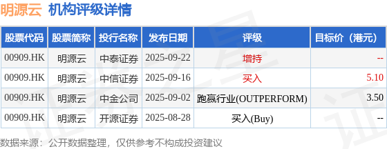 截至2025年11月5日收盘,明源云(00909.HK)报收于3.29港元,下跌0.6%,成交量575.5万股,成交额1866.57万港元。投行对该股的评级以跑赢行业(OUTPERFORM)为主,近90天内共有1家投行给出跑赢行业(OUTPERFORM)评级,近90天的目标均价为4.3港元。中泰证券最新一份研报给予明源云增持评级。