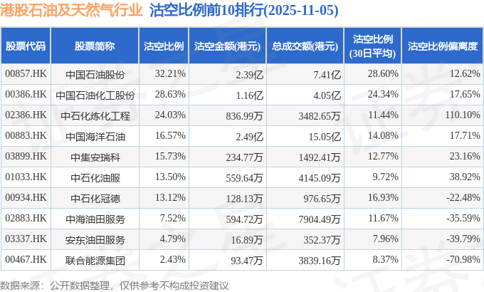 从沽空金额来看,中国海洋石油、中国石油股份、中国石油化工股份沽空金额位居行业前三,分别为2.49亿港元、2.39亿港元、1.16亿港元。