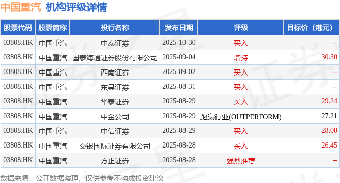 截至2025年11月6日收盘,中国重汽(03808.HK)报收于29.54港元,上涨4.68%,成交量941.54万股,成交额2.78亿港元。投行对该股的评级以买入为主,近90天内共有6家投行给出买入评级,近90天的目标均价为28.24港元。中泰证券最新一份研报给予中国重汽买入评级。