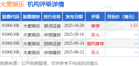 截至2025年11月6日收盘,大麦娱乐(01060.HK)报收于0.94港元,下跌4.08%,成交量2.97亿股,成交额2.82亿港元。投行对该股的评级以买入为主,近90天内共有2家投行给出买入评级,近90天的目标均价为1.55港元。银河证券最新一份研报给予大麦娱乐推荐评级,目标价1.55港元。