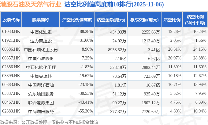 从沽空比例偏离度来看,中石化油服、达力普控股、中国石油化工股份沽空比例偏离度位居行业前三,分别为88.28%、31.66%、8.96%。