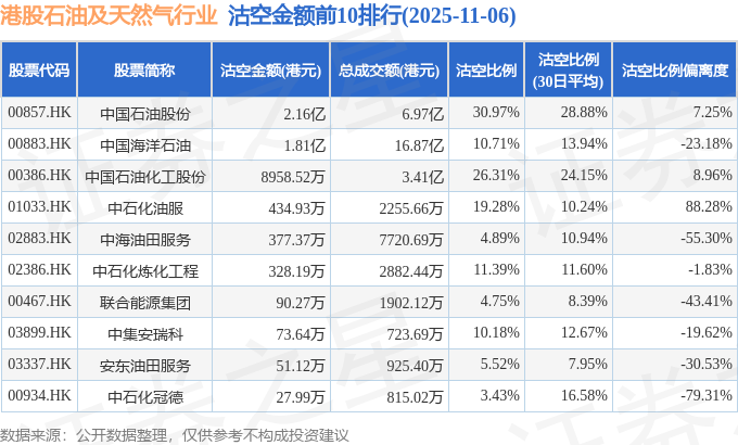 从沽空比例来看,中国石油股份、中国石油化工股份、中石化油服沽空比例位居行业前三,分别为30.97%、26.31%、19.28%。
