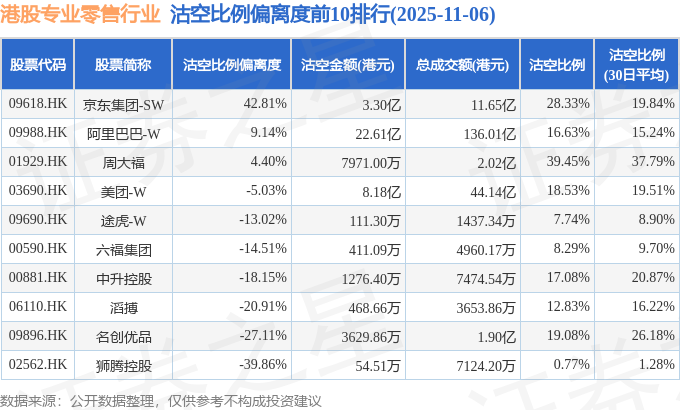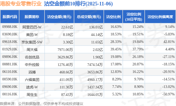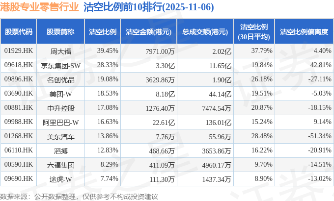 从沽空比例来看,周大福、京东集团-SW、名创优品沽空比例位居行业前三,分别为39.45%、28.33%、19.08%。