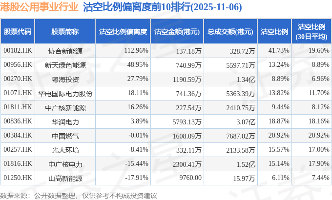 从沽空比例偏离度来看,协合新能源、新天绿色能源、粤海投资沽空比例偏离度位居行业前三,分别为112.96%、48.95%、27.79%。