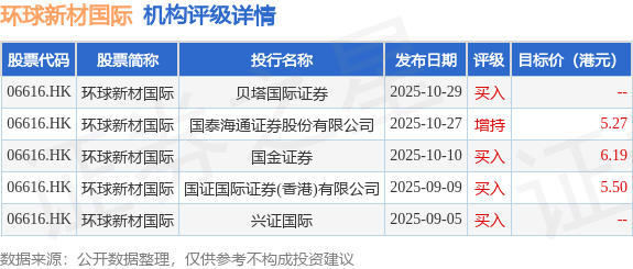 截至2025年11月6日收盘,环球新材国际(06616.HK)报收于6.01港元,下跌1.8%,成交量1621.9万股,成交额9701.32万港元。投行对该股的评级以买入为主,近90天内共有4家投行给出买入评级,近90天的目标均价为5.65港元。贝塔国际证券最新一份研报给予环球新材国际买入评级。