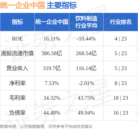 统一企业中国港股市值386.58亿港元,在饮料制造行业中排名第5。主要指标见下表: