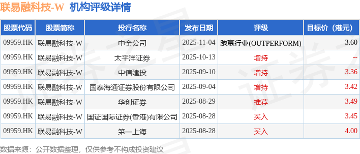 截至2025年11月7日收盘,联易融科技-W(09959.HK)报收于3.14港元,下跌0.63%,成交量609.9万股,成交额1890.23万港元。投行对该股的评级以增持为主,近90天内共有3家投行给出增持评级,近90天的目标均价为3.55港元。中金公司最新一份研报给予联易融科技-W跑赢行业(OUTPERFORM)评级,目标价3.6港元。