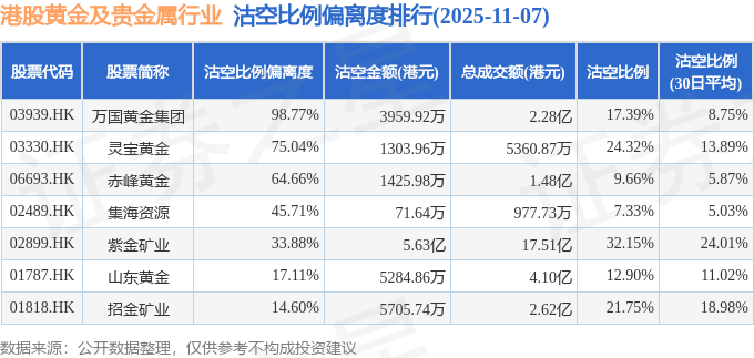 从沽空比例偏离度来看,万国黄金集团、灵宝黄金、赤峰黄金沽空比例偏离度位居行业前三,分别为98.77%、75.04%、64.66%。